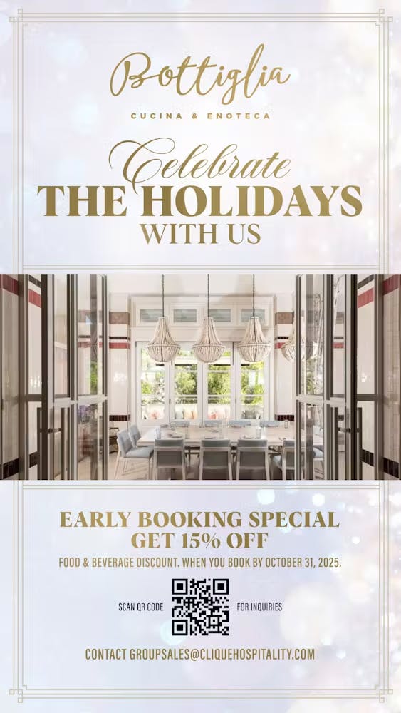 Host your holiday gathering in style at Bottiglia — where Henderson Italian charm meets warm hospitality. Whether you're planning an intimate dinner with friends or a lively company celebration, our inviting space, crafted cocktails, and rustic Italian dishes set the perfect tone for the season.