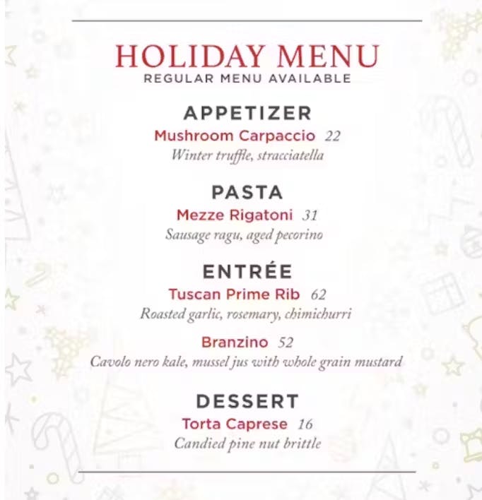Spend your Christmas surrounded by friends, family, and the rustic elegance of Bottiglia. Our chefs have crafted an exclusive holiday menu featuring rich Italian-inspired dishes, luxurious winter ingredients, and festive flavors that capture the spirit of the season. The menu: